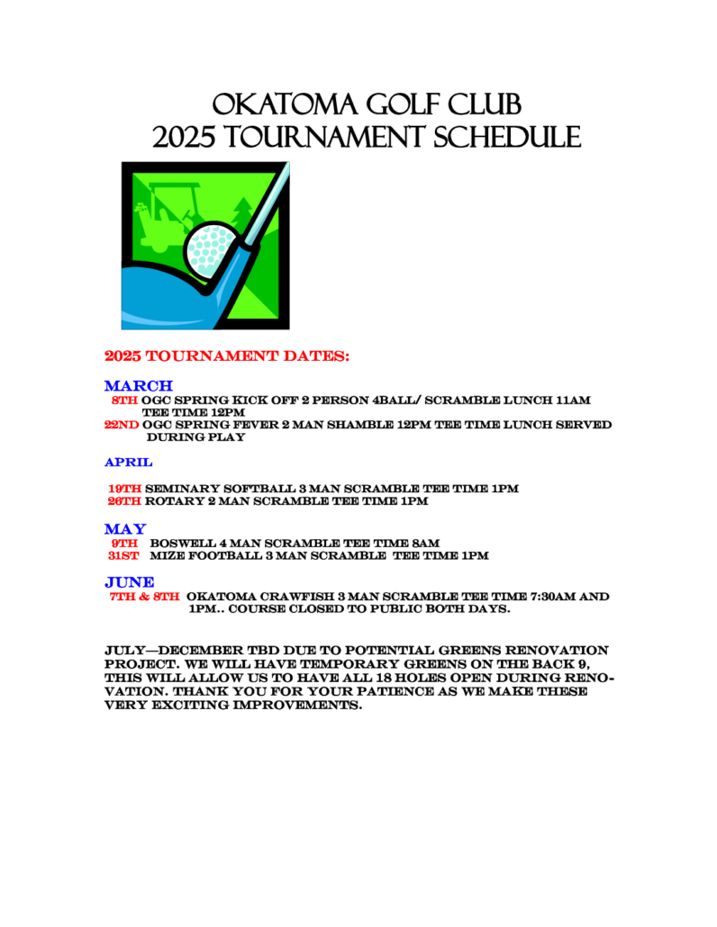 Okatoma Golf Club is excited to announce our 2025 Tournament Schedule!